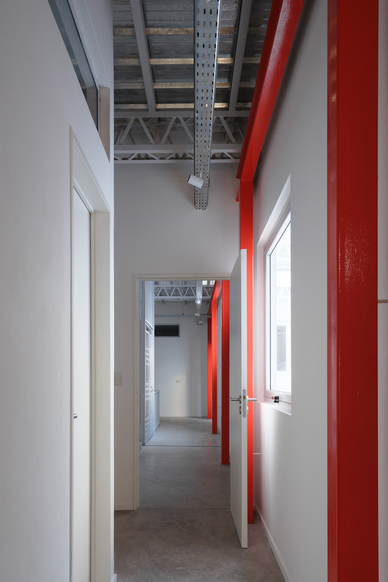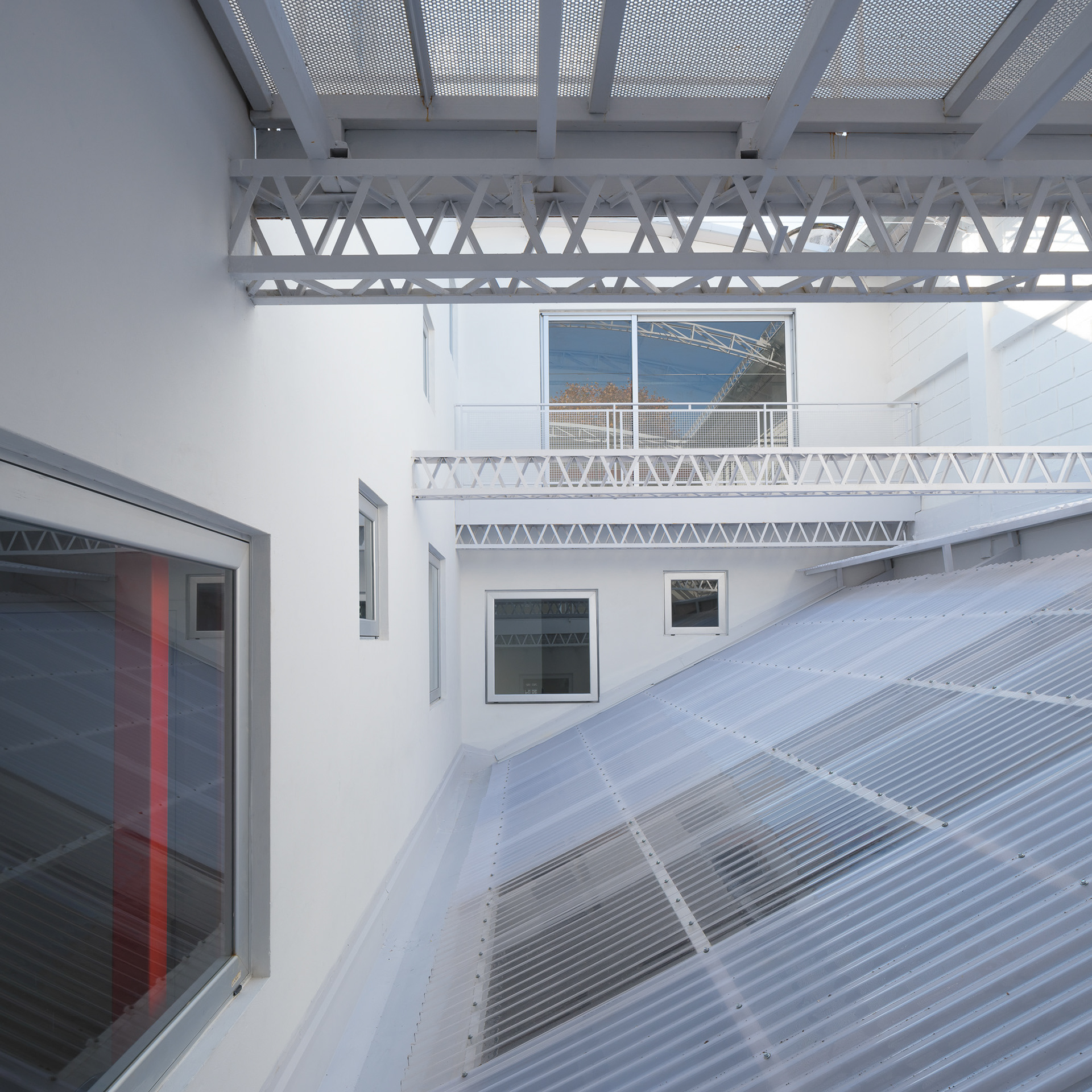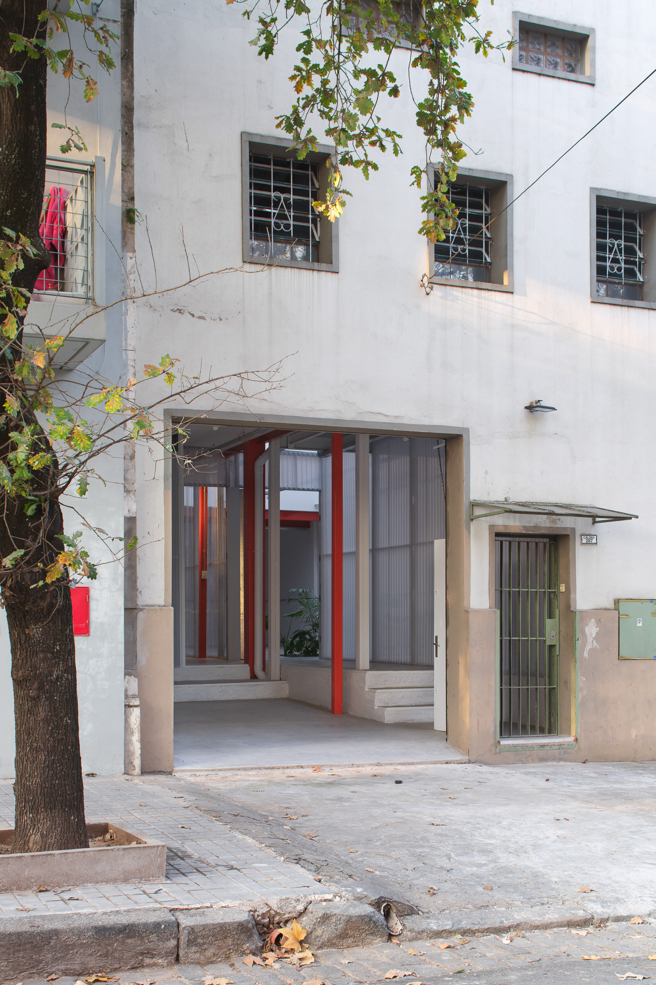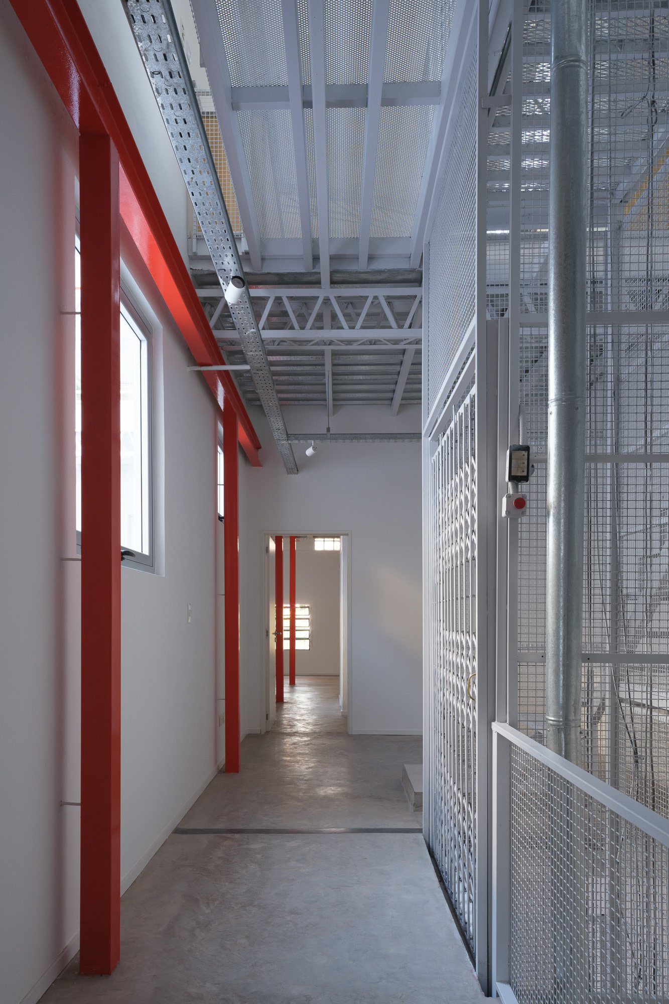 Como cuando se trabaja con preexistencias, este proyecto demandó una presencia constante en la obra, donde el trabajo con la materialidad fue esencial para lograr una relación armónica entre los distintos elementos. En planta baja, las divisiones y accesos se resuelven con policarbonato y una estructura sencilla de steel frame, lo que permite cierta transparencia y liviandad. En cambio, las viviendas se materializan con mampostería, buscando mayor intimidad y confort térmico. Se decide pintar de rojo los refuerzos estructurales para que tomen protagonismo y mantengan viva la presencia estructural característica de las fábricas. Asimismo, se conserva el montacargas, que colabora con la organización de las circulaciones.