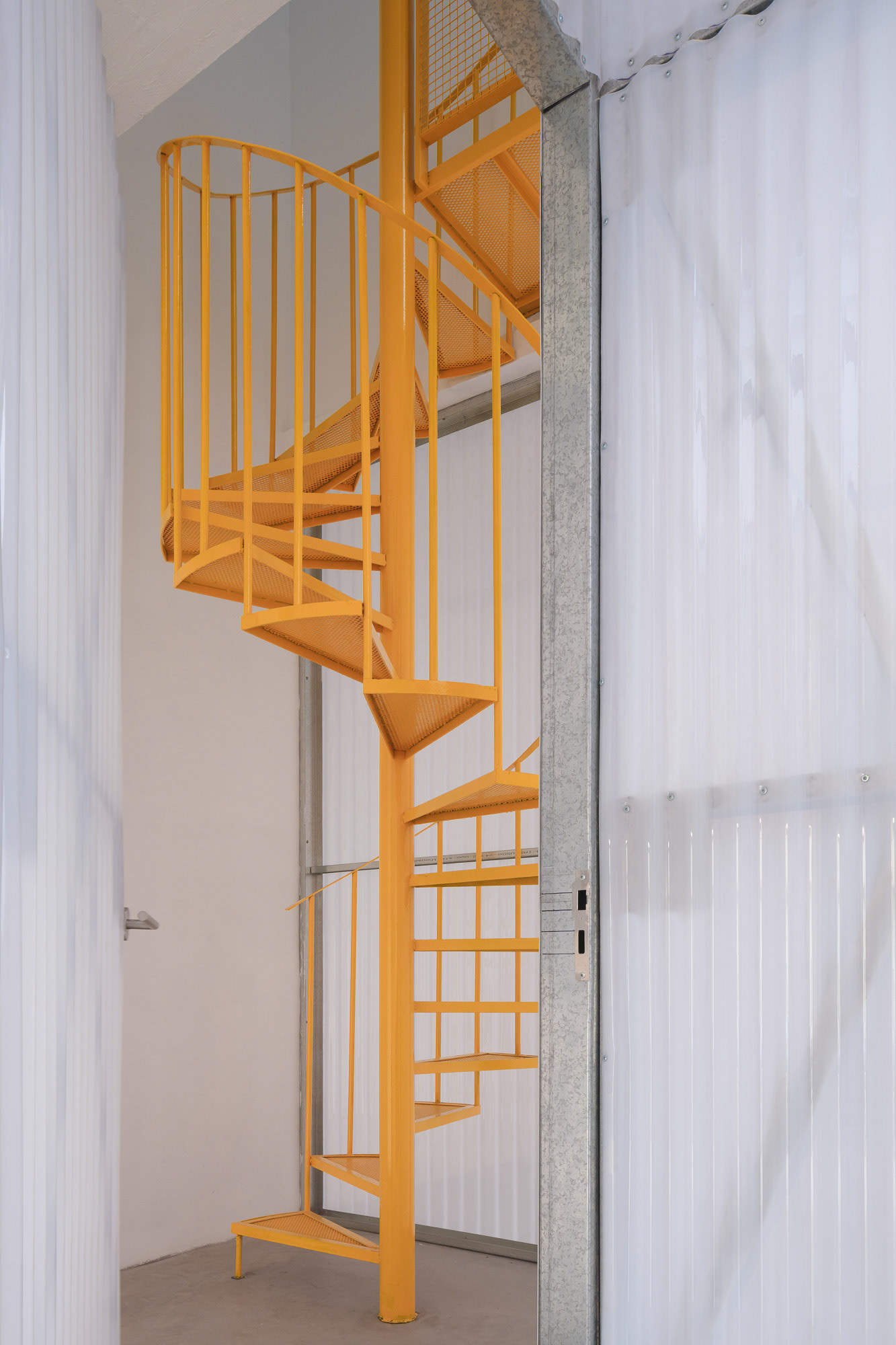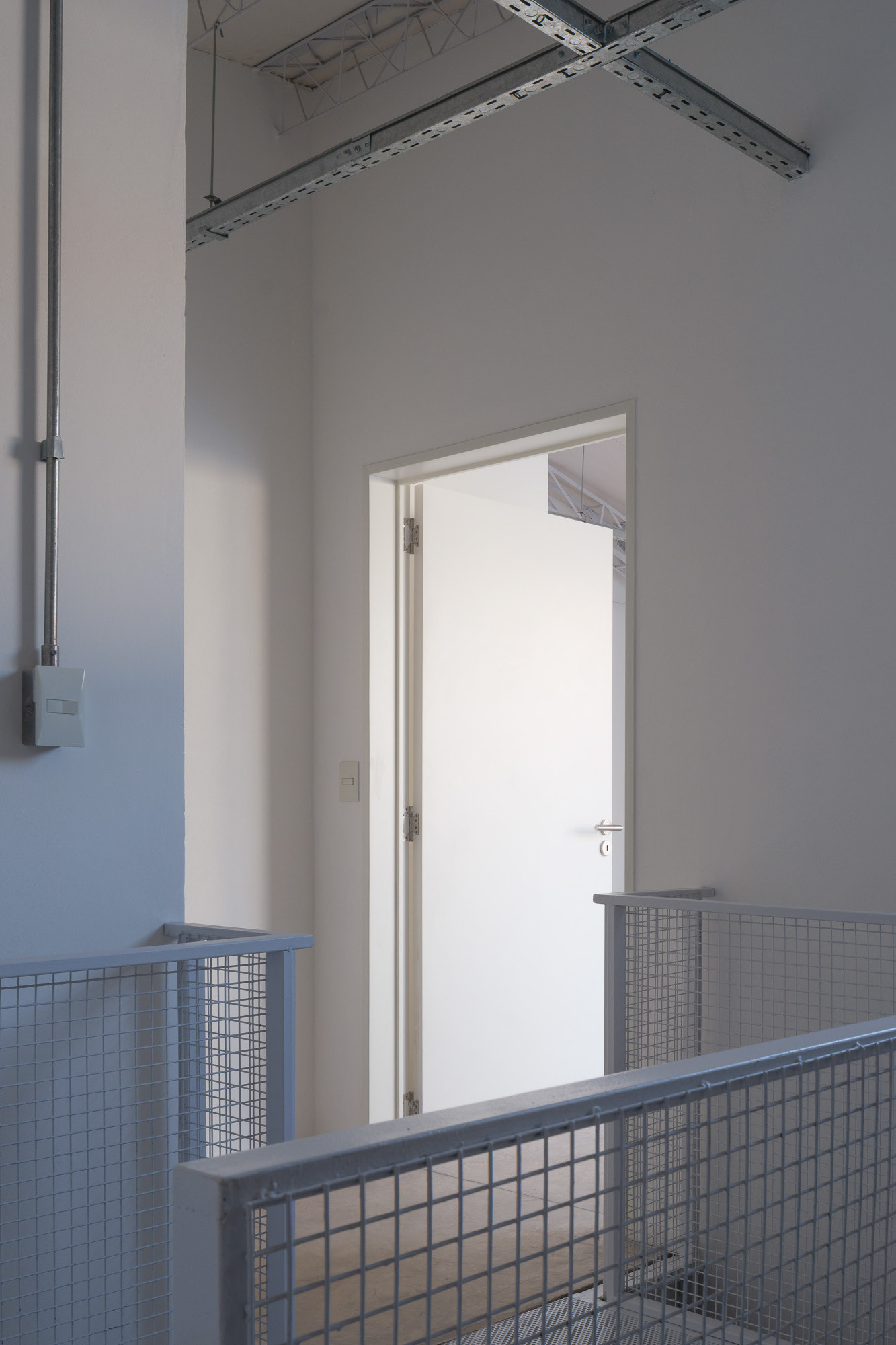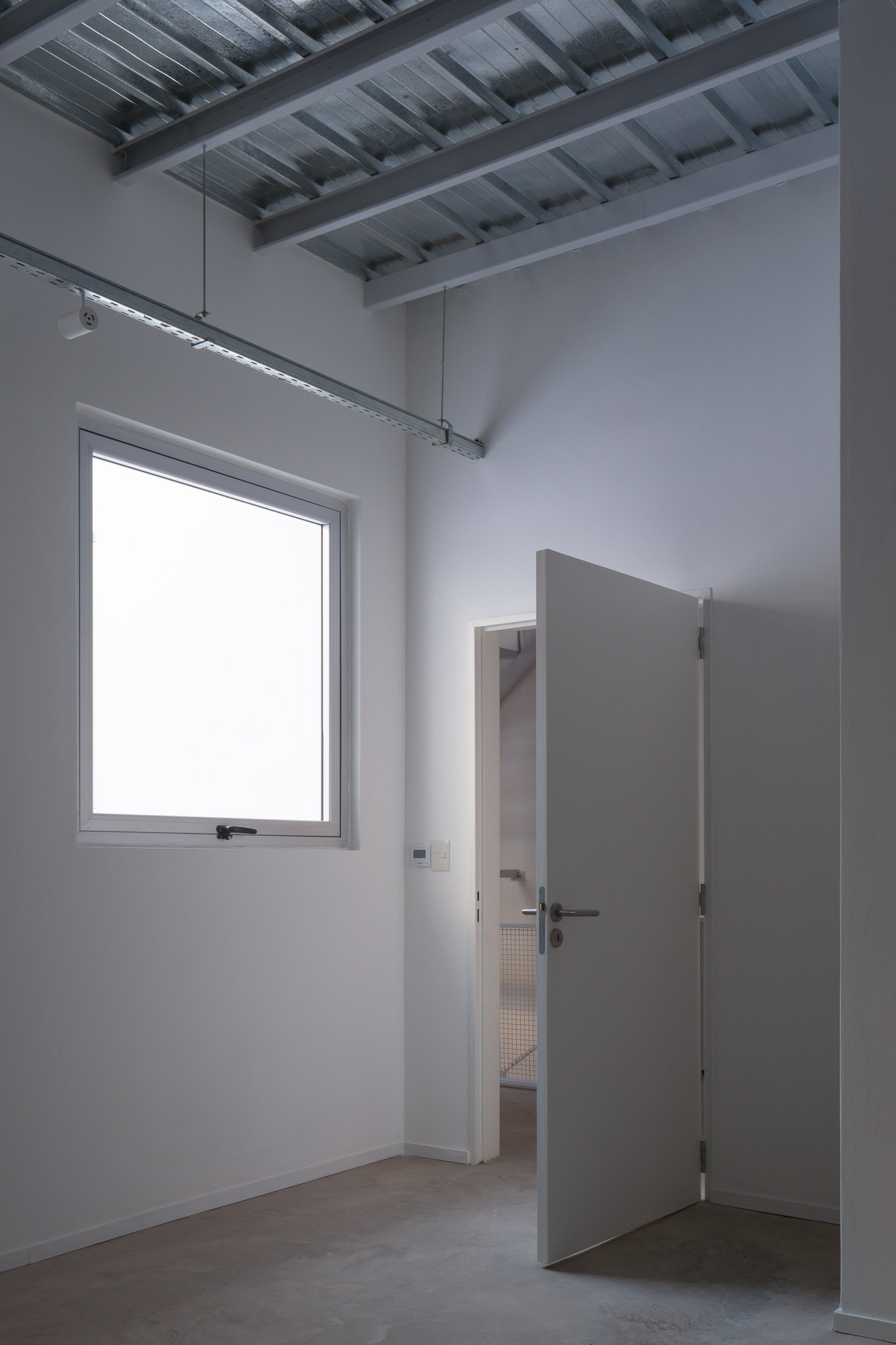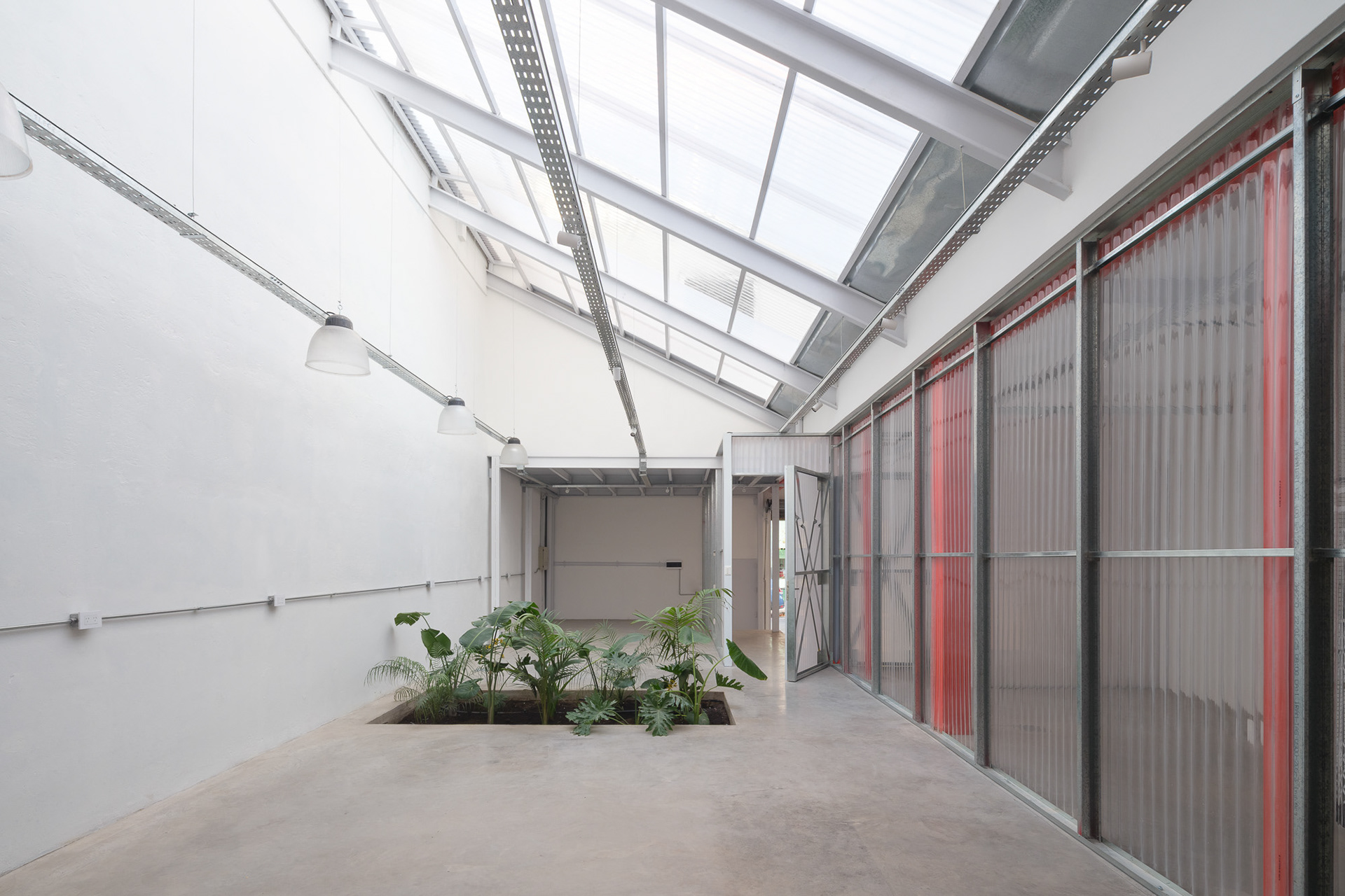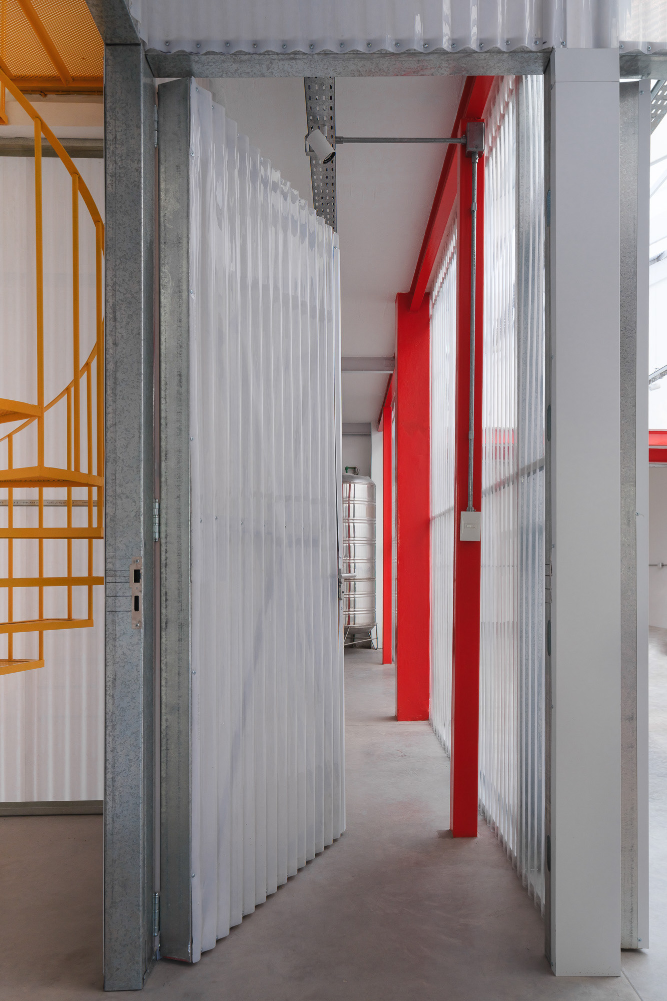 Como cuando se trabaja con preexistencias, este proyecto demandó una presencia constante en la obra, donde el trabajo con la materialidad fue esencial para lograr una relación armónica entre los distintos elementos. En planta baja, las divisiones y accesos se resuelven con policarbonato y una estructura sencilla de steel frame, lo que permite cierta transparencia y liviandad. En cambio, las viviendas se materializan con mampostería, buscando mayor intimidad y confort térmico. Se decide pintar de rojo los refuerzos estructurales para que tomen protagonismo y mantengan viva la presencia estructural característica de las fábricas. Asimismo, se conserva el montacargas, que colabora con la organización de las circulaciones.